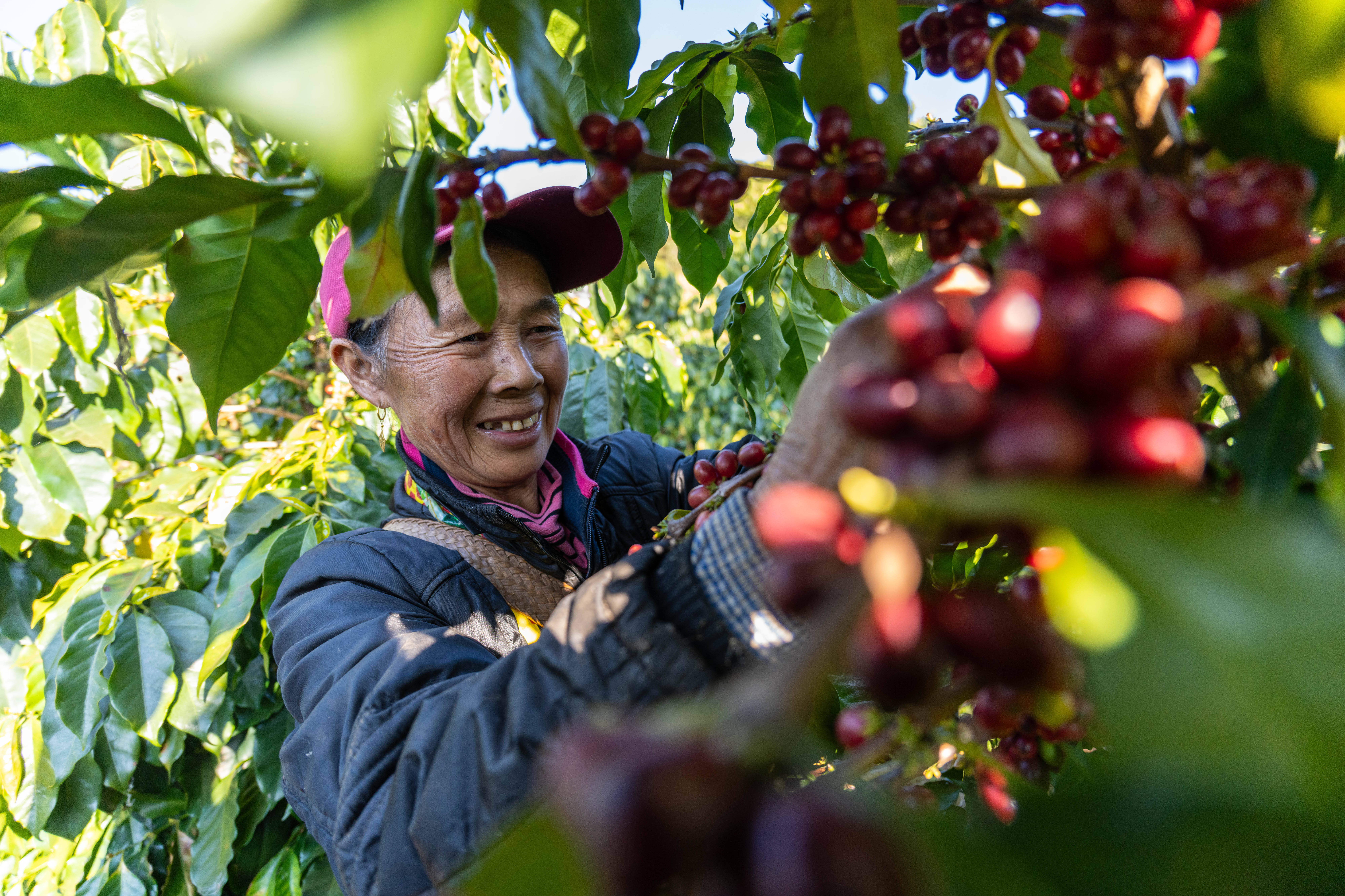 2026年1月23日,咖农在云南省临沧市双江县沙河乡陈家寨村云顶筑巢咖啡庄园采摘咖啡果。新华社记者高咏薇 摄冬日的西双版纳州勐海县勐宋乡,万亩咖啡园里红果缀枝。再往前走,一排排咖啡树在林荫间生长,“咖啡+遮荫树”的复合种植模式,让咖啡与热带森林共生。勐海原雀咖啡庄园里,晾晒场上铺满了咖啡豆,加工车间内,全自动无水(微水)咖啡鲜果初加工生产线高效运转,从清洗、分选分级到脱皮、脱胶一气呵成。
