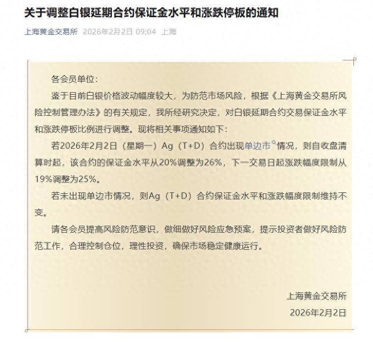 若2026年2月2日股票配资利率(星期一)Ag(T+D)合约出现单边市情况,则自收盘清算时起,该合约的保证金水平从20%调整为26%,下一交易日起涨跌幅度限制从19%调整为25%。