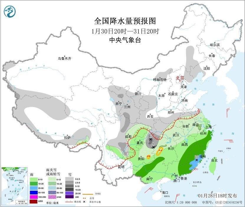 r1月30日20时至31日20时,新疆西部和南部、西藏南部、内蒙古中东部、华北东北部、东北地区南部、西北地区中东部、黄淮南部、江汉、江淮、江南西北部、西南地区中部和东部等地部分地区有小雪或雨夹雪,其中,甘肃南部、湖北南部、湖南西北部、川西高原北部、四川东南部、重庆东南部、贵州东北部等地部分地区有中到大雪(5~9毫米)。江淮东南部、江南大部、西南地区东部、华南、台湾岛等地部分地区有小到中雨,其中,福建东南部、广东东部等地部分地区有大雨(25~35毫米)。东海大部海域、巴士海峡、北部湾海域、南海东北部海域有5~7级风、阵风8级(见图3)。