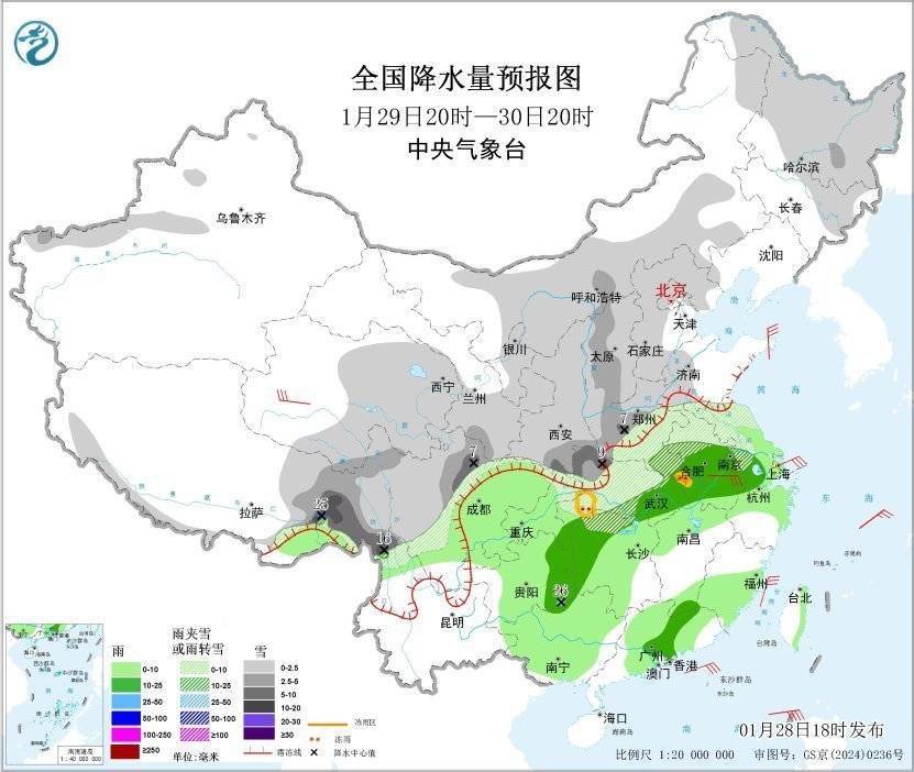 图1 全国降水量预报图(1月28日20时-29日20时)