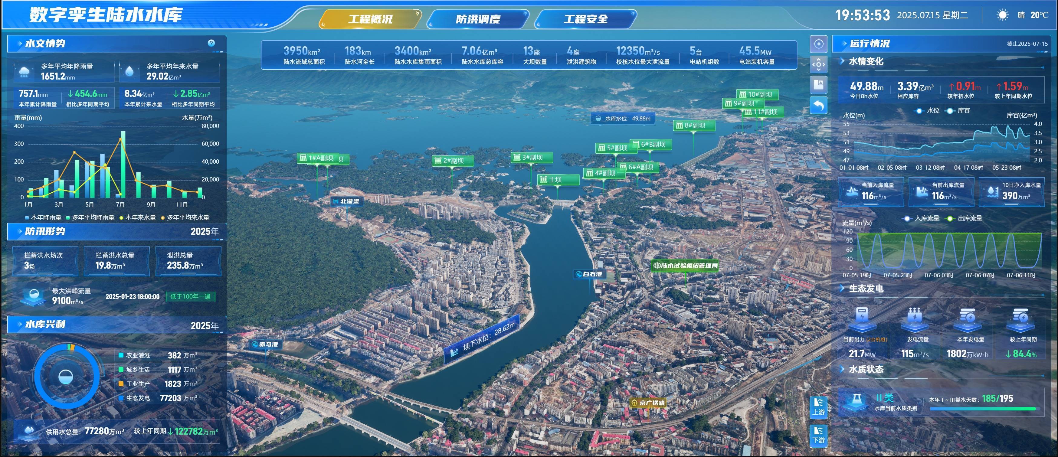 打开“数字孪生陆水水库”系统,工程概况、防洪调度、水文水质情况一目了然。