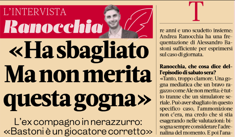 虎扑02月16日讯 前国际米兰中卫拉诺基亚今天接受了《米兰体育报》的专访,并且对国米vs尤文一战中的争议事件发表了看法,重点谈到了当事人巴斯托尼。