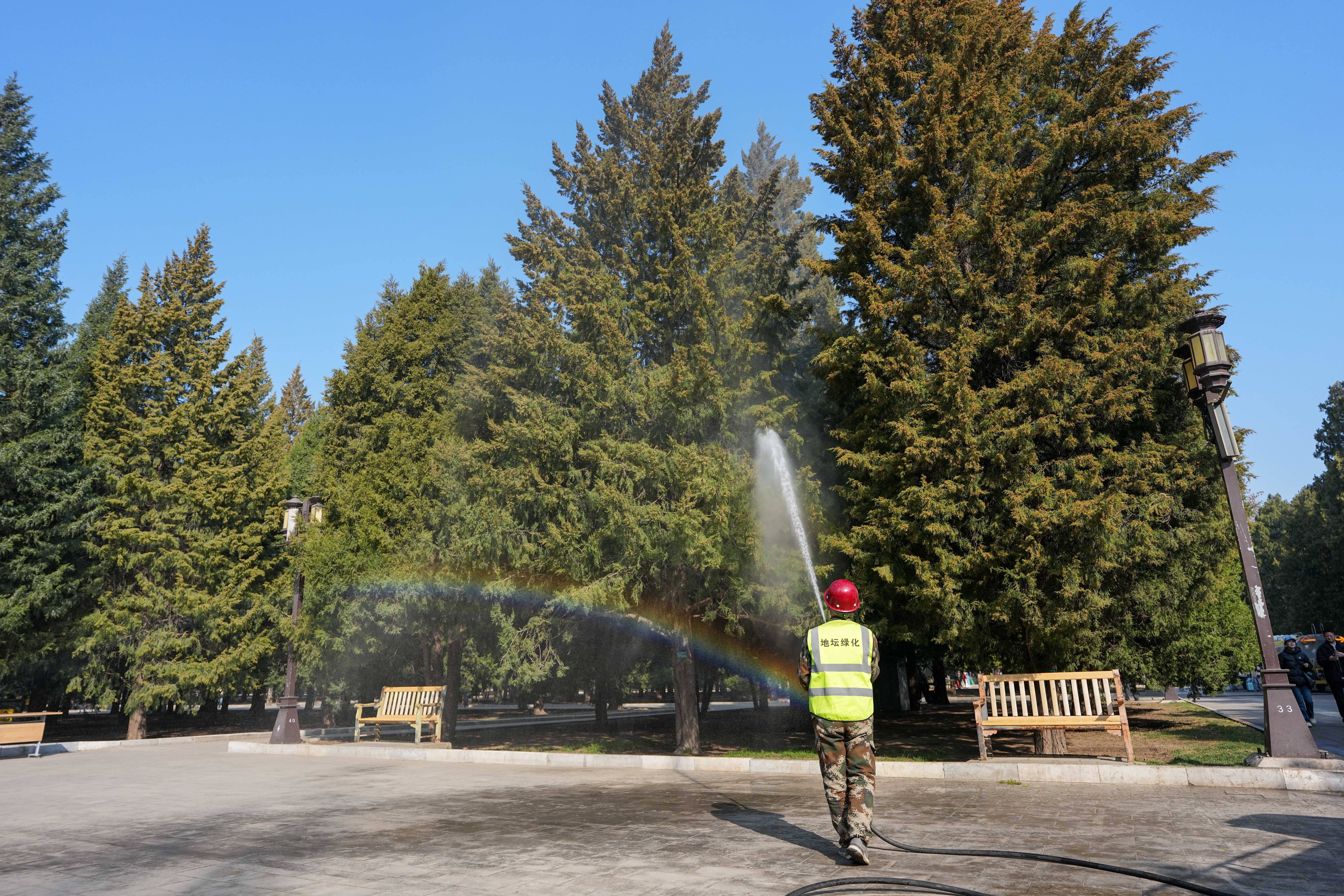 3月15日,在北京地坛公园,工作人员使用添加了花粉控制剂的水对柏树进行喷淋。新华社记者 鞠焕宗 摄世界过敏组织数据显示,全球约30%的人口受过敏性疾病困扰,而我国过敏性鼻炎患者数量高达2.5亿,花粉过敏已成为不容忽视的公共卫生问题。