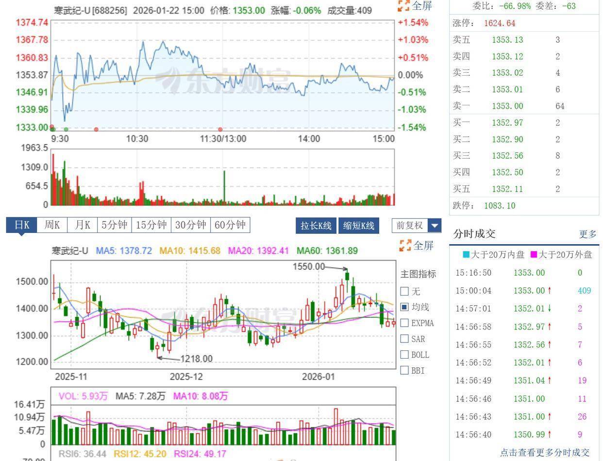 据观察,位居榜单首位的寒武纪于2016年在北京成立,专注于AI核心处理器芯片的研发,成功打造“中国AI芯片第一股”。2025年上半年,寒武纪实现营收28.8亿元,同比大幅增长43倍。寒武纪还深化与国内外头部大模型企业的合作,主导或参与45项国际及国内技术标准的制定。该公司的三季报显示,2025年前三季度实现营业收入46.07亿元,同比增长2386.38%,归母净利润为16.05亿元,同比扭亏。报告期内,寒武纪保持高研发投入,前三季度公司研发投入合计7.15亿元(同比+8.45%),第三季度研发投入2.58亿元(同比+22.05%)。截至1月22日,收盘价为1353元/股,总市值达5705亿元。