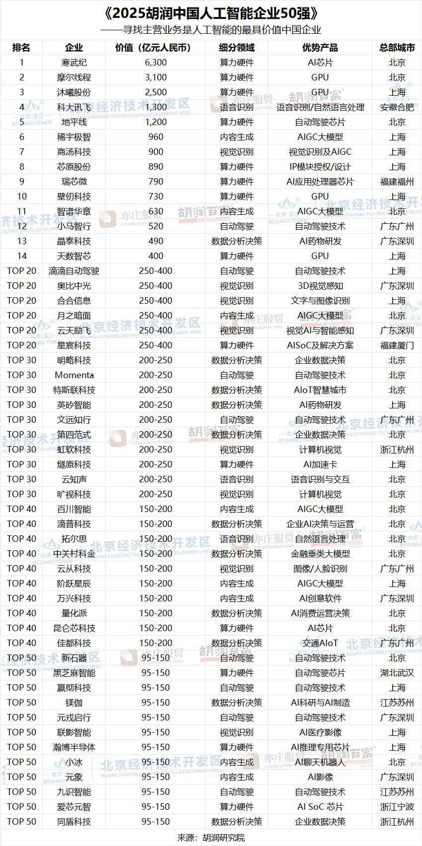 这份由胡润研究院发布的榜单《2025胡润中国人工智能企业50强》聚焦于主营业务为AI算力或算法的中国企业,按照企业价值进行排名。上市公司市值按照2026年1月9日的收盘价计算,非上市公司估值参考同行业上市公司或者根据最新一轮融资情况进行估算。这是胡润研究院第二次发布该主题榜单。