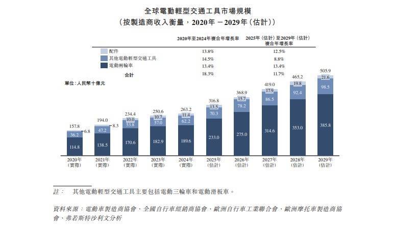 受益于全球“碳中和”倡议推进、各国环保政策支持及消费端绿色出行需求升级,电动轻型交通工具行业迎来快速发展期。根据弗若斯特沙利文数据,2024年全球电动轻型交通工具市场规模达2632亿元,2020-2024年复合年增长率18.3%,预计2029年将增至5059亿元,2025-2029年复合年增长率约11.7%。
