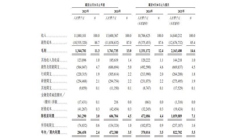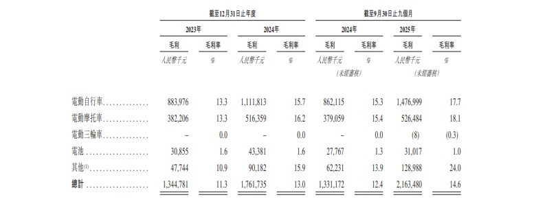 招股书显示,台铃科技近年经营业绩保持强劲增长态势。收入方面,2023年、2024年及2025年前九月分别实现收入118.80亿元、136.00亿元及148.40亿元,2024年同比增长14.5%,2025年前九月同比增长38.6%。
