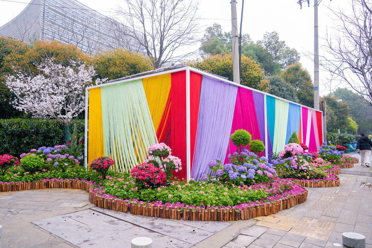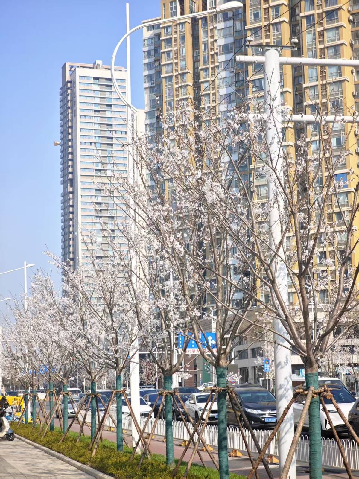 建设三路,有法桐、樱花、绿地,还有报春花在路边吆喝加油呢。