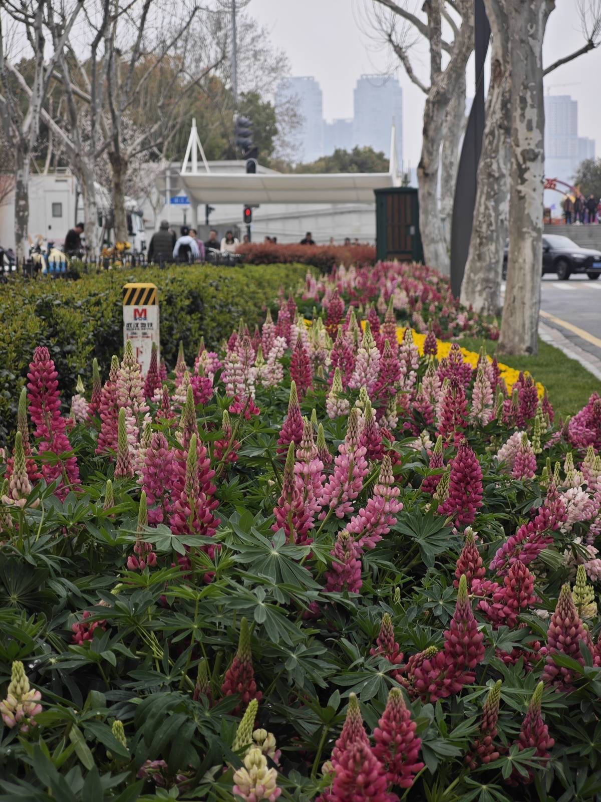 汉马起点沿江大道三阳路路口附近,红润鲁冰花昂扬向上,沿江大道路边,紫红紫罗兰和金黄角堇的经典撞色,提气提神。