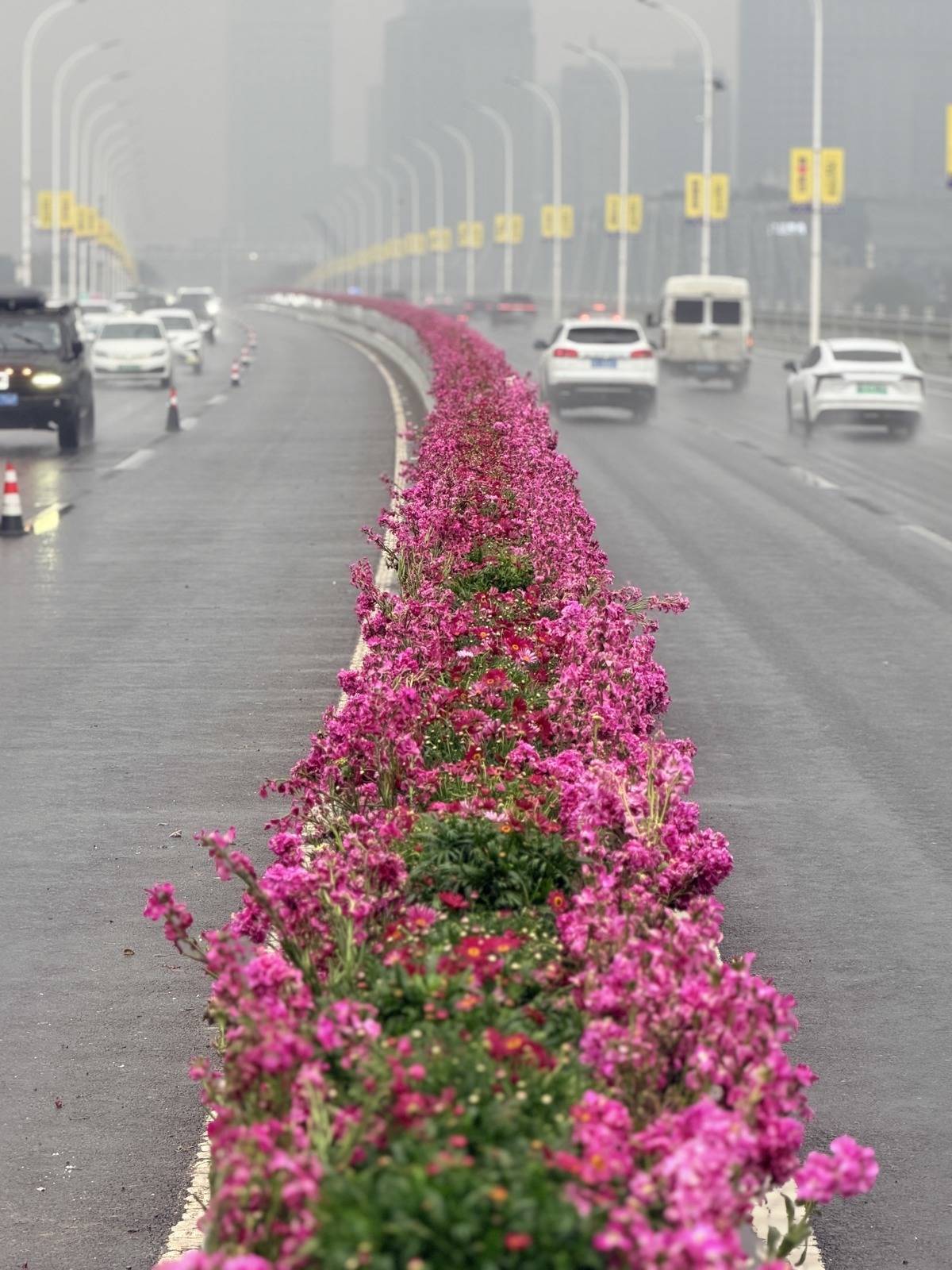 沙湖大桥中分带,那是紫罗兰牵手枣红玛格丽特飘起的瑰丽彩带。